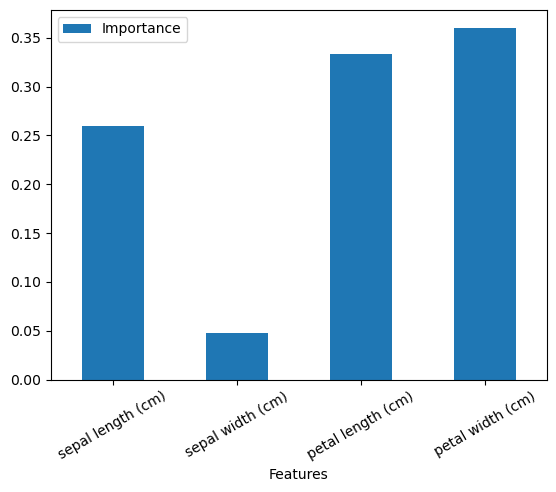 ft_import.plot.bar(x='Features', y='Importance', rot=30)