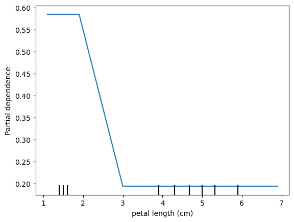 pd_plot = PartialDependenceDisplay.from_estimator(rf, X_train, ['petal length (cm)'], target='setosa')
