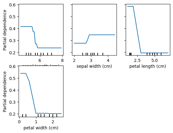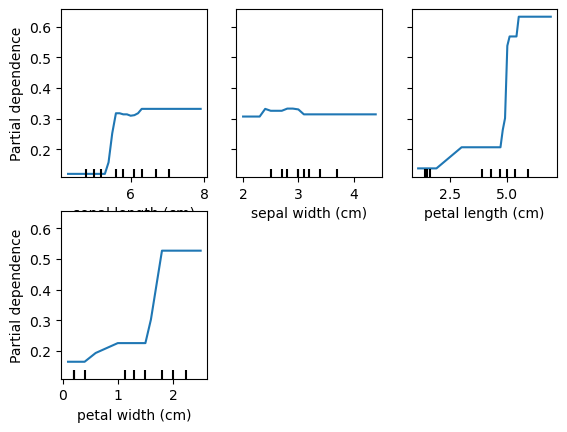 PartialDependenceDisplay.from_estimator(rf, X_train, data.feature_names, target=target)Target is: setosa