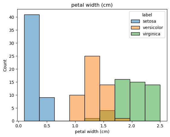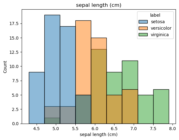 sns.histplot(x=df[feat], hue=df['label']).set(title=feat)