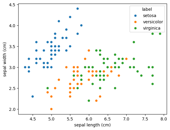 df.head()| sepal length (cm) | sepal width (cm) | petal length (cm) | petal width (cm) | target | label | |