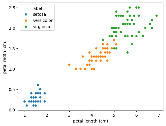 sns.scatterplot(data=df, x='petal length (cm)', y='petal width (cm)', hue='label')