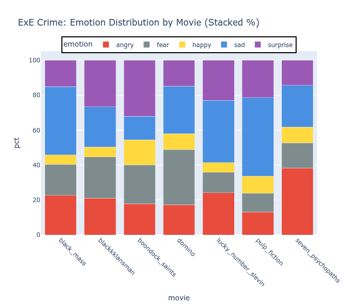 Here’s the emotion distribution across seven comedies — from Black Mass to Seven Psychopaths — for all three models: