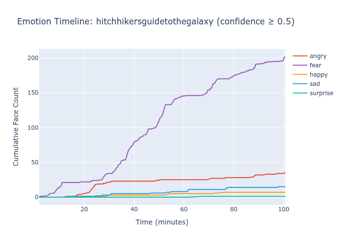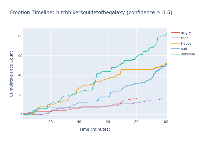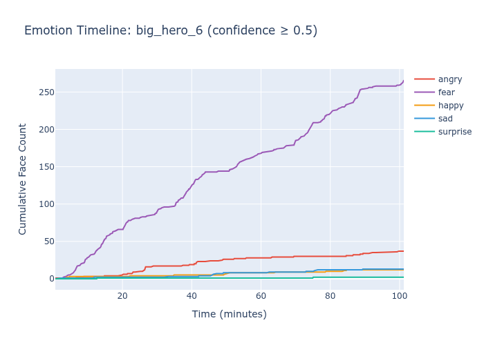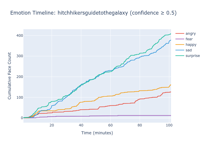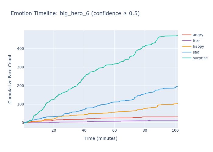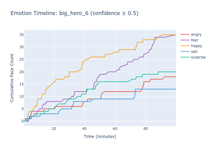 I ran all three models against approximately 60 full-length films, extracting predictions every 100th frame. The idea was simple: a good emotion recognition model should produce temporal patterns that reflect narrative structure. Comedies should show more happiness. Dramas should show more sadness. Emotional inflection points — reunions, conflicts, revelations — should produce visible shifts.