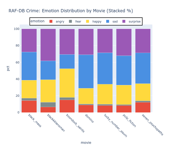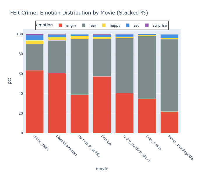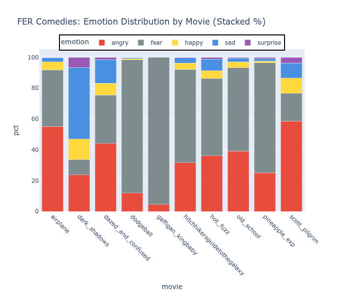 ExE and RAF detect substantial happy (yellow) and sad (blue), with meaningful variation between films. Dark Shadows and Dodgeball have different emotional profiles, which tracks — they’re very different movies. Of note, RAF-DB shows very strong levels of surprise (purple) for every film regardless of content. FER detects mostly fear and anger with very little happy.