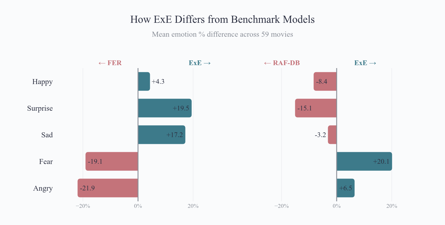 ExE’s stock photo training data includes more varied compositions, lighting conditions, and expression intensities. The domain gap to movie content is smaller, so the model’s predictions retain meaningful variation.