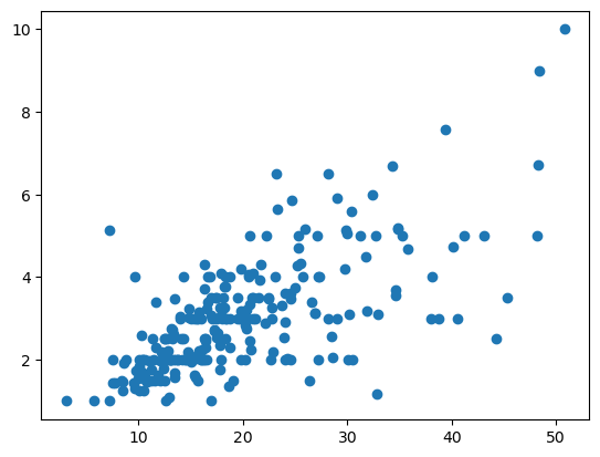 plt.scatter(tips['total_bill'], y=tips['tip'])
