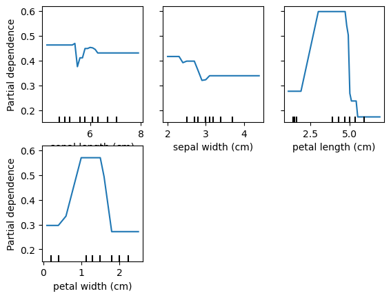 PartialDependenceDisplay.from_estimator(rf, X_train, data.feature_names, target=target)Target is: setosa