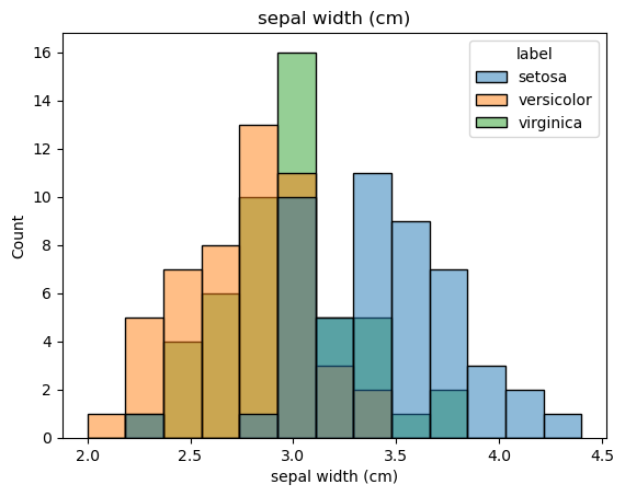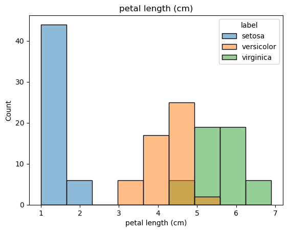 sns.histplot(x=df[feat], hue=df['label']).set(title=feat)