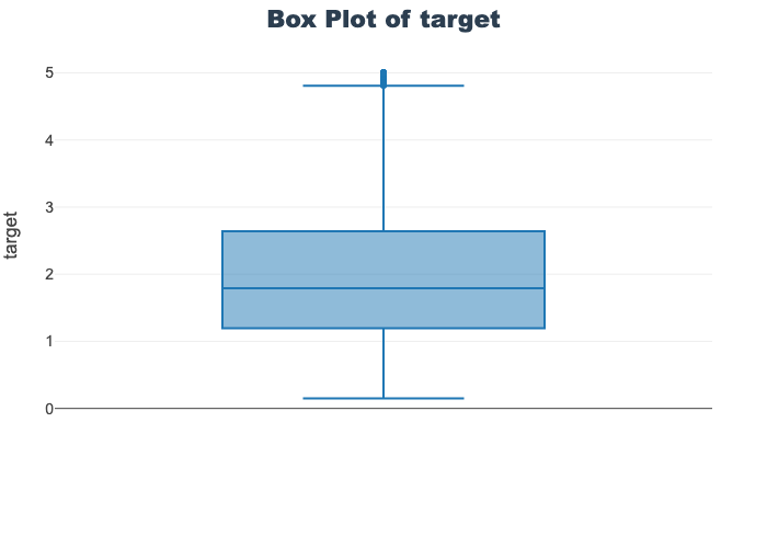 skim(train_df)╭──────────────────────────────────────────────── skimpy summary ─────────────────────────────────────────────────╮ │ Data Summary Data Types │ │ ┏━━━━━━━━━━━━━━━━━━━┳━━━━━━━━┓ ┏━━━━━━━━━━━━━┳━━━━━━━┓ │ │ ┃ Dataframe ┃ Values ┃ ┃ Column Type ┃ Count ┃ │ │ ┡━━━━━━━━━━━━━━━━━━━╇━━━━━━━━┩ ┡━━━━━━━━━━━━━╇━━━━━━━┩ │ │ │ Number of rows │ 13828 │ │ float64 │ 9 │ │ │ │ Number of columns │ 9 │ └─────────────┴───────┘ │ │ └───────────────────┴────────┘ │ │ number │ │ ┏━━━━━━━━━━━━━━┳━━━━━┳━━━━━━━┳━━━━━━━━━━┳━━━━━━━━━━┳━━━━━━━━━┳━━━━━━━━━┳━━━━━━━━━┳━━━━━━━━┳━━━━━━━━━┳━━━━━━━━┓ │ │ ┃ column ┃ NA ┃ NA % ┃ mean ┃ sd ┃ p0 ┃ p25 ┃ p50 ┃ p75 ┃ p100 ┃ hist ┃ │ │ ┡━━━━━━━━━━━━━━╇━━━━━╇━━━━━━━╇━━━━━━━━━━╇━━━━━━━━━━╇━━━━━━━━━╇━━━━━━━━━╇━━━━━━━━━╇━━━━━━━━╇━━━━━━━━━╇━━━━━━━━┩ │ │ │ MedInc │ 0 │ 0 │ 3.877 │ 1.903 │ 0.4999 │ 2.569 │ 3.539 │ 4.757 │ 15 │ ▅█▂ │ │ │ │ HouseAge │ 0 │ 0 │ 28.56 │ 12.6 │ 1 │ 18 │ 29 │ 37 │ 52 │ ▂▆███▅ │ │ │ │ AveRooms │ 0 │ 0 │ 5.437 │ 2.449 │ 0.8889 │ 4.46 │ 5.232 │ 6.059 │ 141.9 │ █ │ │ │ │ AveBedrms │ 0 │ 0 │ 1.098 │ 0.4457 │ 0.3333 │ 1.007 │ 1.05 │ 1.1 │ 25.64 │ █ │ │ │ │ Population │ 0 │ 0 │ 1431 │ 1146 │ 3 │ 793 │ 1170 │ 1729 │ 35680 │ █ │ │ │ │ AveOccup │ 0 │ 0 │ 3.129 │ 12.65 │ 0.6923 │ 2.432 │ 2.82 │ 3.282 │ 1243 │ █ │ │ │ │ Latitude │ 0 │ 0 │ 35.65 │ 2.134 │ 32.55 │ 33.94 │ 34.27 │ 37.72 │ 41.95 │ █▃▁▆▁ │ │ │ │ Longitude │ 0 │ 0 │ -119.6 │ 2.005 │ -124.3 │ -121.8 │ -118.5 │ -118 │ -114.3 │ ▁▆▂█▃ │ │ │ │ target │ 0 │ 0 │ 2.067 │ 1.154 │ 0.15 │ 1.194 │ 1.792 │ 2.64 │ 5 │ ▄█▆▃▂▂ │ │ │ └──────────────┴─────┴───────┴──────────┴──────────┴─────────┴─────────┴─────────┴────────┴─────────┴────────┘ │ ╰────────────────────────────────────────────────────── End ──────────────────────────────────────────────────────╯